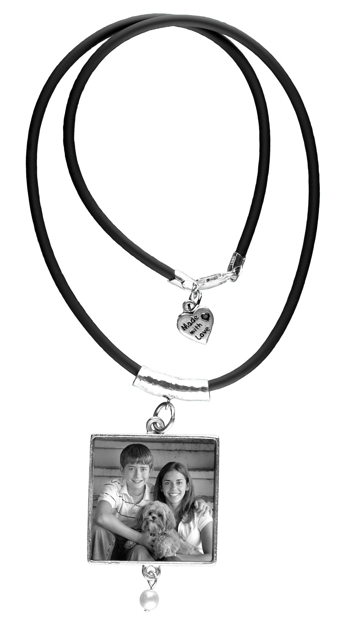 You will love this necklace! This 1¼” square pewter pendant with a pearl attached to the bottom swings off a sterling silver hammered bead. Along with the 18" 3mm black rubber cord necklace, Genevieve's eclectic mix has a special look all its own.