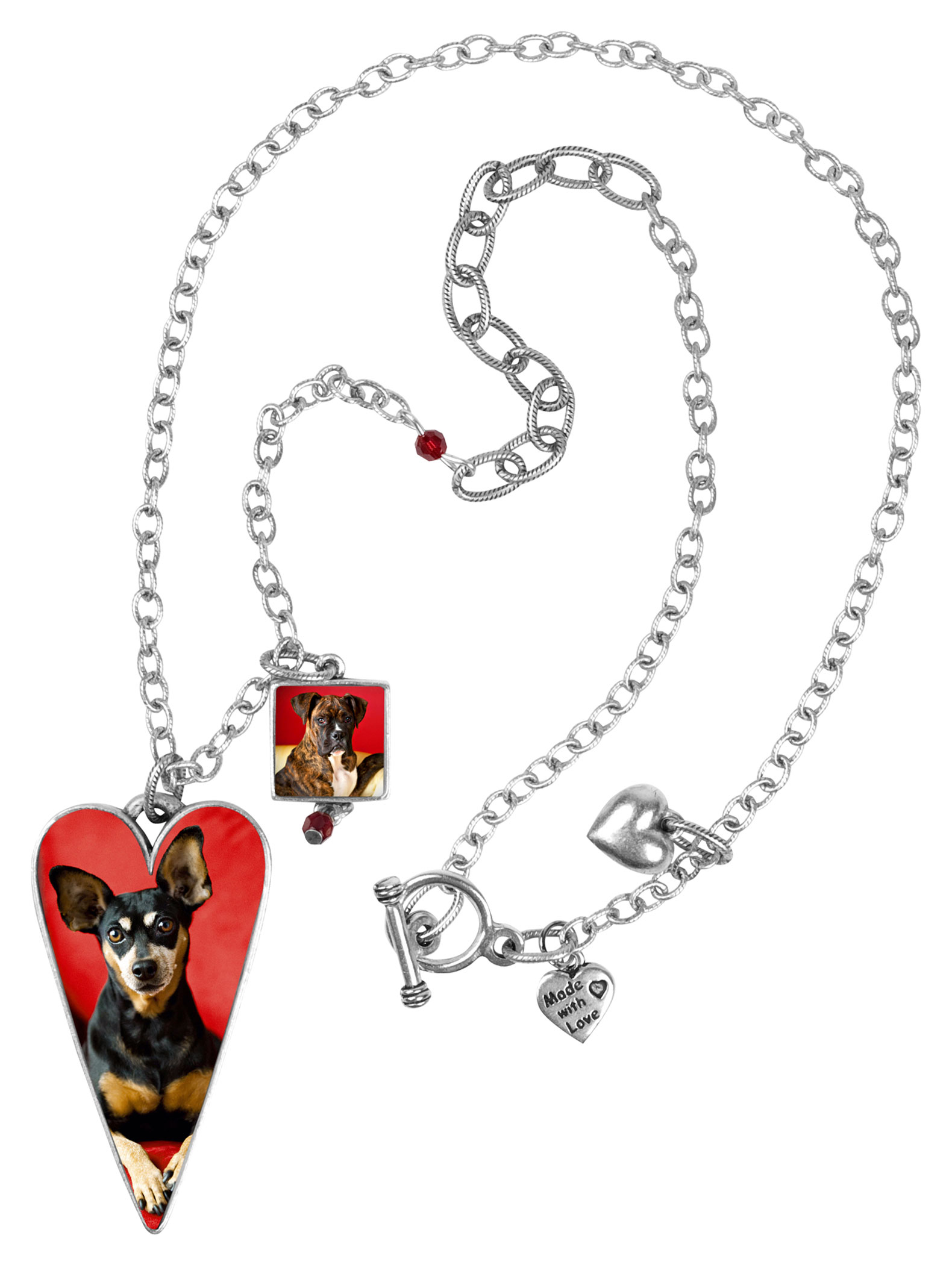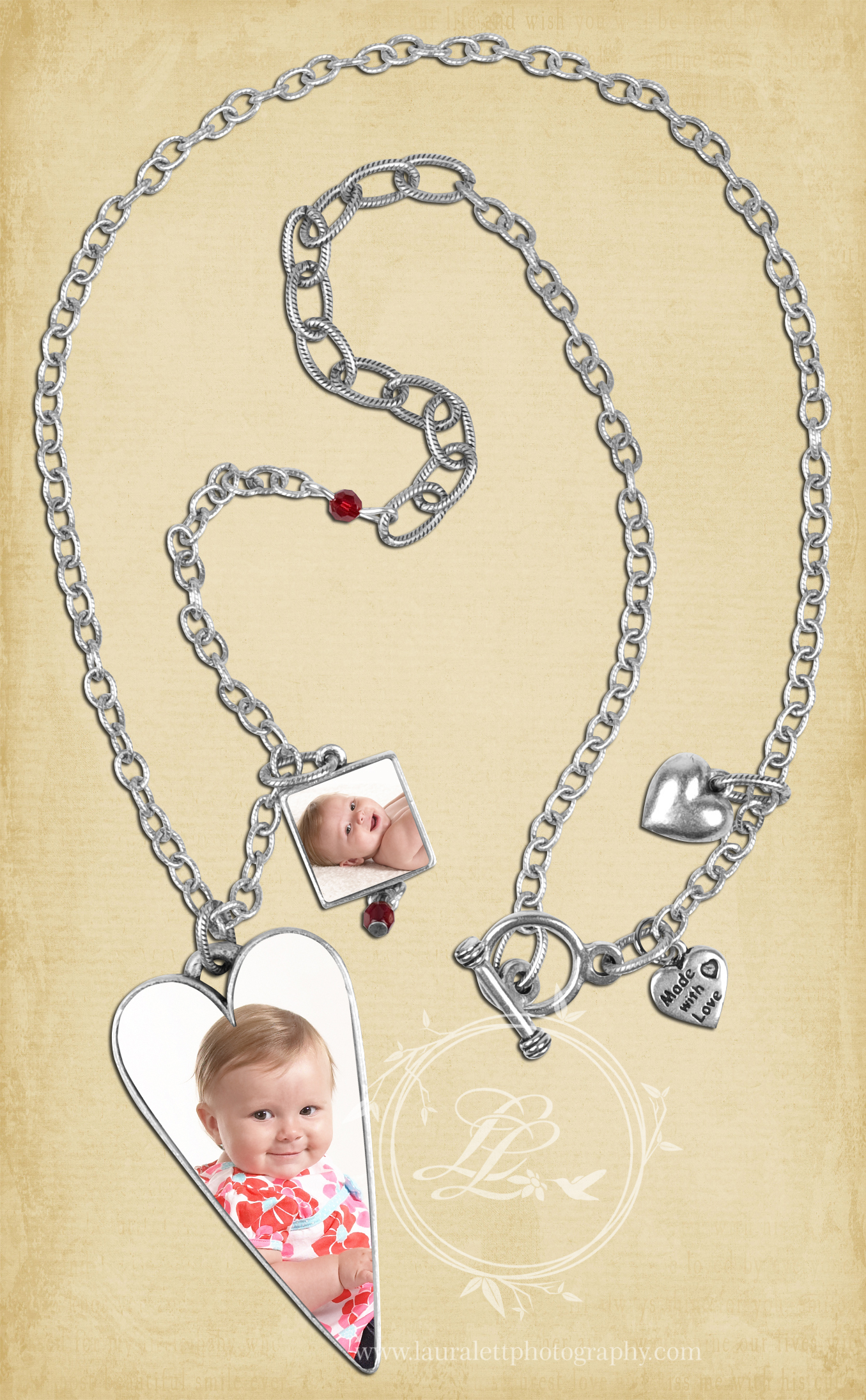 The Love Struck necklace includes two photo charms and a silver heart charm. The heart photo charm is 1 1/16" x 2 2/16" and the small square charm is ½"x½". The 18" small textured cable chain features a large textured cable chain insert with a garnet colored bead.