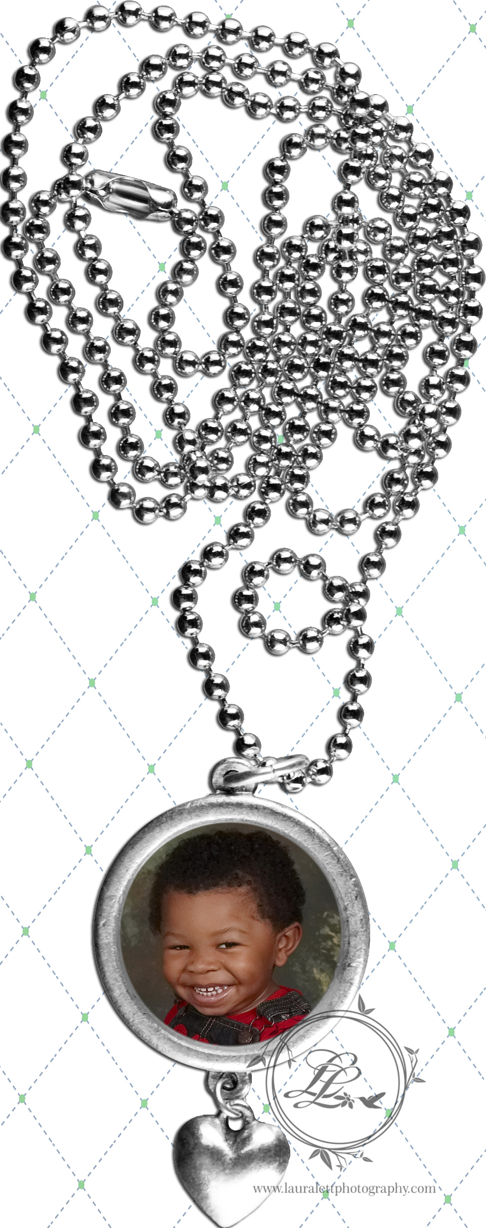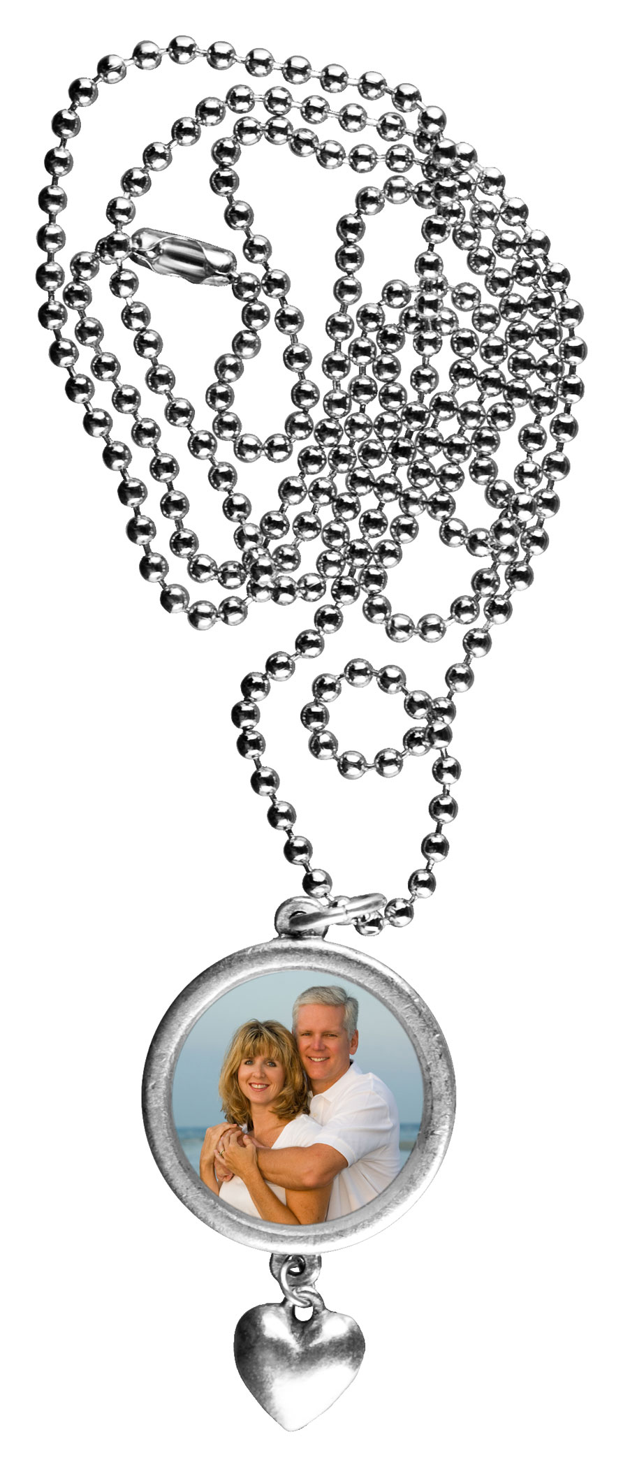This round pewter pendant comes with a fun heart dangled from the bottom to remind you of who you love! Worn on a 25” ball chain, the image will be a 13⁄16” circle in size.