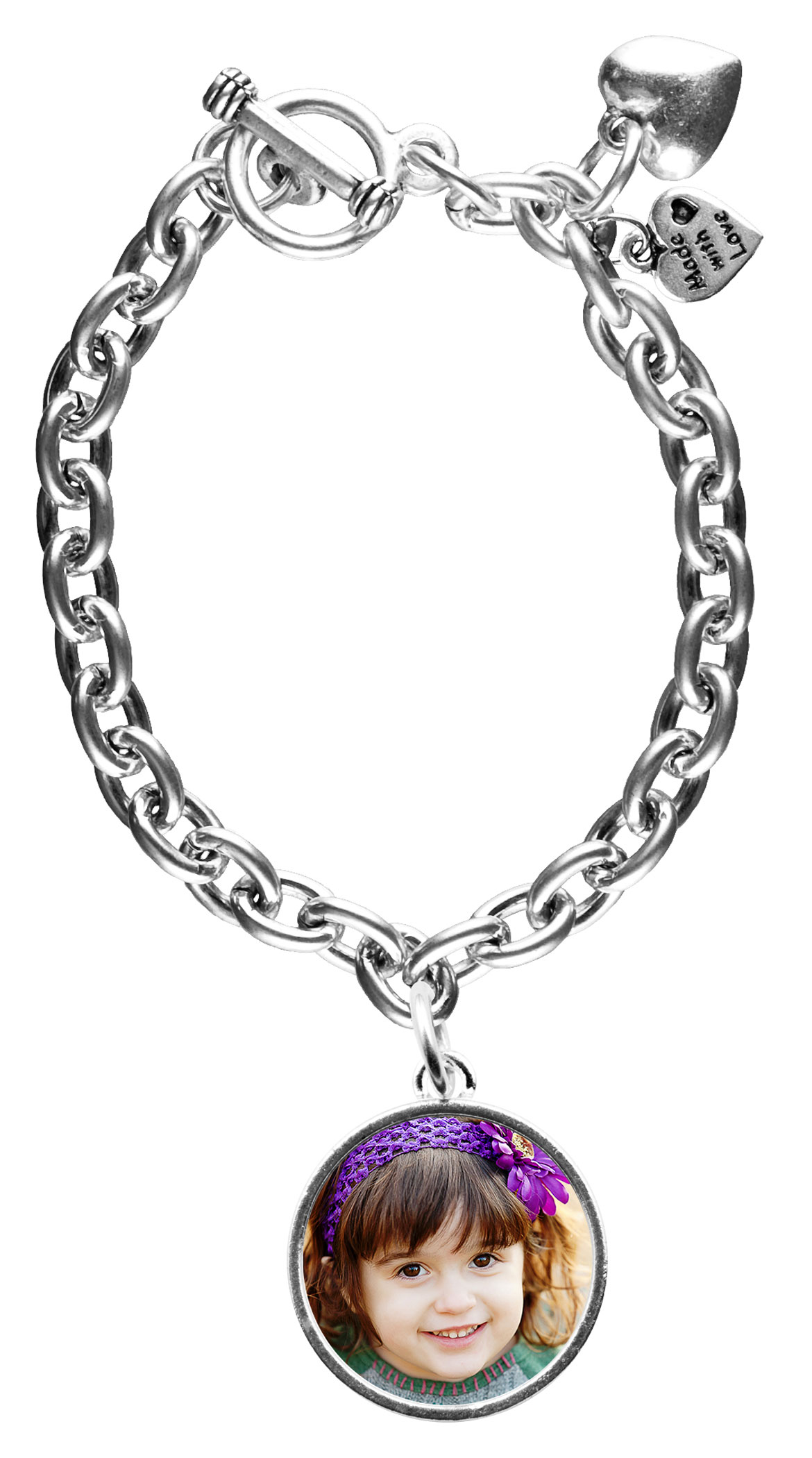 Fill this bracelet with photo charms of your favorite images. This antique silver-plated 7½” bracelet comes with one lead free pewter 13⁄16” single sided circle charm. Add-on charms are identical to the original charm.